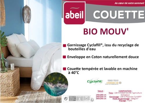 Enveloppe en coton issu de l’agriculture biologique et garnissage Cyclafill®. Le garnissage Cyclafill®, marque déposée par Abeil, garantit l’utilisation de 50% minimum de fibres issues du recyclage de bouteilles d’eau minérale.