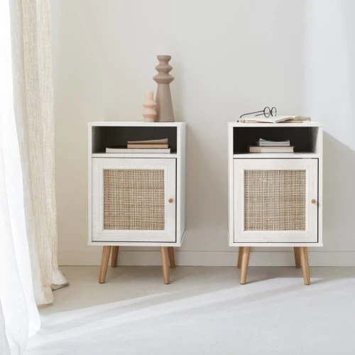Une touche de naturel, une touche de modernité et voilà deux jolies tables de chevet en cannage. Posez vos lampes de chevet et tout ce que vous voulez garder à portée de main sur les deux niveaux, et ranger vos livres du moment dans l’espace de rangement fermé. Le reste de la table est en décor bois pour s’accorder parfaitement avec la porte en cannage. Les tables de chevet bohème ont une porte réversible, vous avez la possibilité de choisir l’orientation de la porte.