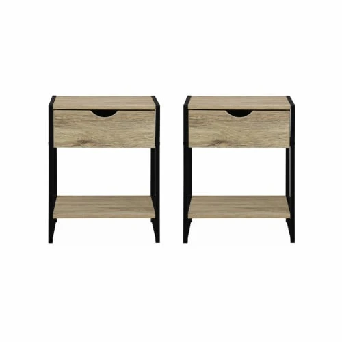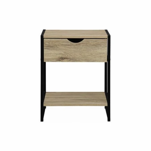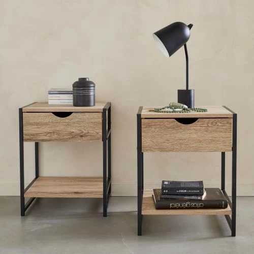 Ce lot de deux tables de chevet est idéal pour ajouter un côté industriel à votre intérieur. Leur bi-matière combinant le noir et la couleur claire, rend le tout très tendance. Dotées d’un tiroir et d’une étagère vous disposerez de deux rangements fonctionnels pour ranger vos affaires. Dans leur tiroir avec poignet à encoche, vous pourrez placer vos lunettes, télécommandes et tous autres objets que vous souhaitez dissimuler. Quant à leur étagère, pourquoi ne pas y mettre vos livres, et autres éléments décoratifs ? Enfin placez sur leur plateau : bougies, réveil, crèmes de nuit, lampes et portable. Modernisé votre chambre à coucher en adoptant pour ce lot de deux tables de chevet industriel et authentique.