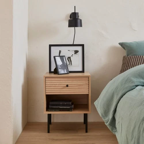 Si vous souhaitez apporter une touche d’élégance et de modernité à votre chambre à coucher, cette table de chevet au décor bois rainuré est la pièce parfaite pour vous. Son style contemporain et sa couleur naturelle apporteront un véritable charme à votre pièce, tandis que son design simple lui permet de s’intégrer facilement à tout décor existant. De petite taille, cette table de chevet n’aura aucun mal à trouver une place à côté de votre lit. Grâce à ses détails en métal noir mat, votre chambre sera au goût du jour.