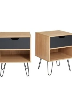 Lot de 2 tables de chevet DUO avec tiroir – Structure en panneaux de particules – Revêtement en papier décor bois et noir – Pieds épingle en métal laqué noir – Dimensions : L40xP34xH50cm