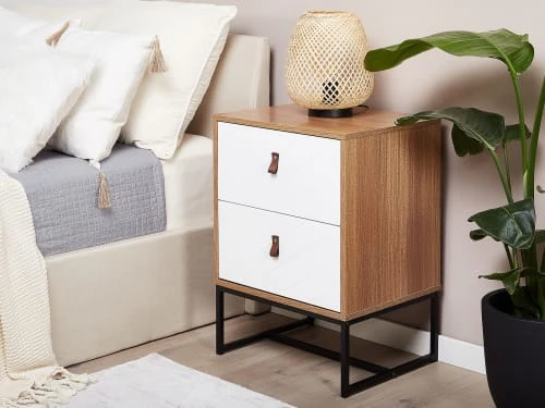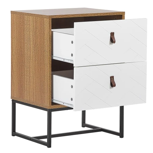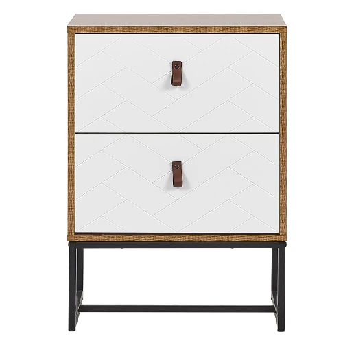 Si vous recherchez des meubles de rangement traditionnels avec une touche moderne, cette table de chevet est un excellent choix. Fabriquée en MDF durable effet bois clair et blanc, elle repose sur un piétement en métal noir. Cette table de nuit comporte 2 tiroirs offrant un espace de rangement supplémentaire pour vos livres, bijoux et autres objets quotidiens. Remarquez les poignées design en simili-cuir et le motif à chevron subtils, en effet cette table de chevet a tout pour plaire et rehausser le look de votre chambre.