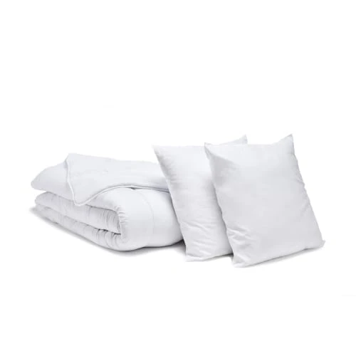 Couette enveloppe 100% Microfibre et garnissage synthétique. Oreillers enveloppe 100% coton et garnissage synthétique.