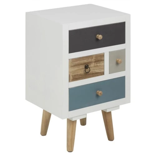 Craquez pour cette magnifique table de chevet composée de 4 tiroirs de couleurs différentes. Ses tiroirs de couleur bleu, anthracite et bois ainsi que ses diverses poignées lui donnent un certain caractère. Ce meuble saura raviver votre pièce en lui apportant une belle touche décorative ! Ses pieds obliques en bois lui ajoutent un air scandinave. Vous pouvez vous en servir aussi bien de table de chevet que de petit meuble de rangement. Il ajoutera sans aucun doute du cachet à votre intérieur !