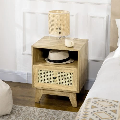– Table de chevet style bohème naturel aspect bois de manguier avec façade de tiroir en cannage rotin