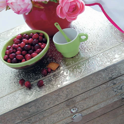 Imposez votre style avec cette table de chevet JAIPUR d’inspiration indienne. Ce chevet en bois, recouvert d’une feuille de métal ciselée, comporte un tiroir et 2 portes pour tout ranger. A coordonner avec le superbe meuble cabinet aux 14 tiroirs.</p>