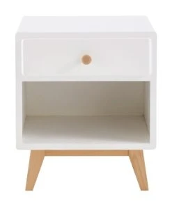 Et si vous complétiez la chambre de votre enfant d’une jolie touche vintage ? La table de chevet 1 tiroir blanche SWEET séduira par son design inspiré des pays nordiques. Accompagnée de pieds obliques, cette table de nuit se révélera être très pratique. Son plateau accueillera une jolie lampe du même style, son tiroir quelques objets personnels, et l’étagère mettra joliment en valeur ses nombreux livres. Votre enfant va adorer cette table de chevet !</p>