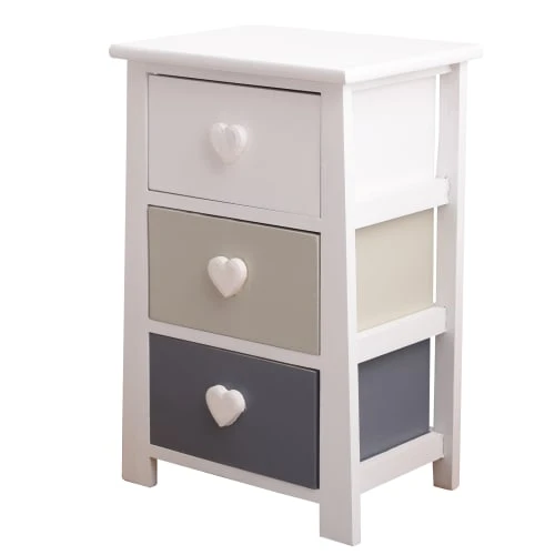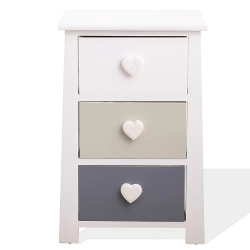 • Meuble d’appoint de style shabby-chic, idéal pour les petits espaces, en bois de paulownia avec poignées élégantes en forme de cœur. Parfait pour décorer n’importe quelle pièce à vivre, pour la salle de bain ou la chambre à coucher. Une maison dans un style naturel et romantique avec la gamme REBECCA ROMANTICA. • Dimensions : H 56 cm x L 37 cm x P 27 cm • Dimensions des tiroirs : H 14 cm x L 26,5 cm x P 23,5 cm • Le meuble sera expédié assemblé • Couleur: Blanc, Gris, Beige • Cod. RE4366