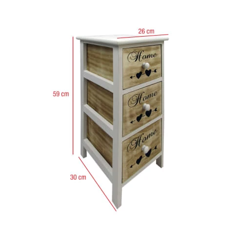 o Dimensions: H 59 cm x L 26 cm x P 30 cm o Dimensions des tiroirs (3): H 14,5 cm x L 19,5 cm x P 25 cm o Couleur: Blanc, Beige, Noir