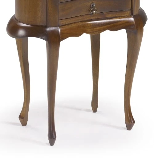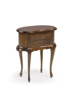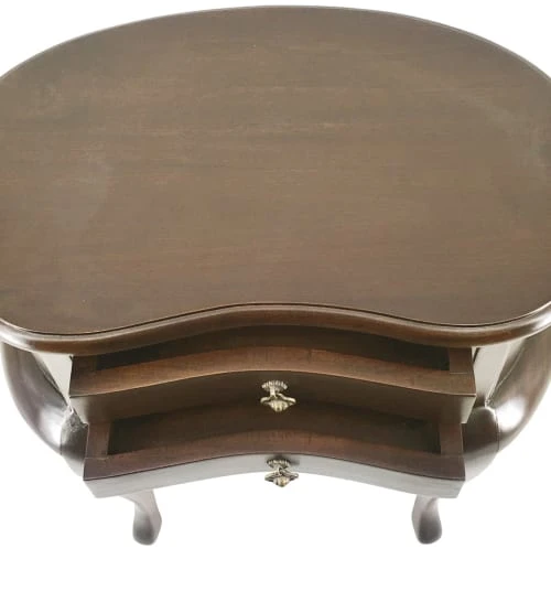 Table de chevet Angela de la collection VINTAGE, faite en bois d’acajou, lignes vivantes et un joli travail artisanal. Elle dispose de deux tiroirs avec poignées en bronze.