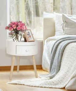 HOMCOM Table De Chevet 2 Tiroirs – Bois Pin Bambou MDF Blanc
