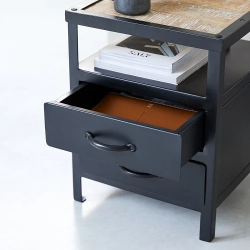 Chevet 2 tiroirs en métal.Info : 2 tiroirs (H 9,5 x L 30,5 x P 30,5 cm) – 1 niche (H 9,5 x L 30 x P 35 cm)Informations Produit :Matière : MétalDimensions : H 45 x L 35 x P 35 cmPoids : 12,5 kg environAcheter un meuble Tikamoon, c’est acheter une pièce exclusive, dessinée avec passion par nos équipes. Concepteur de mobilier d’intérieur, Tikamoon propose des collections exclusives de meubles en bois massif.