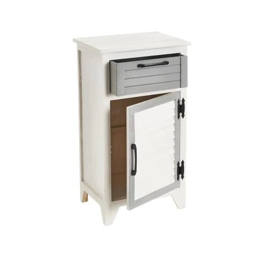 Table de chevet en bois blanc et gris finition cérusé comprenant 1 tiror et 1 placard.