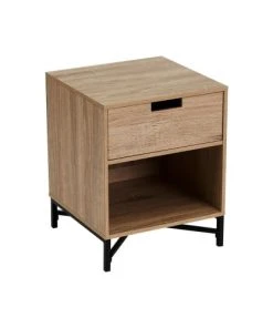 Table de chevet en bois MDF et métal noir comprenant 1 tiroir et 1 casier. Matière: MDF et Métal – Couleur: Bois et Noir – Dimensions: Hauteur 40cm x largeur 39.5cm x Longueur 50cm